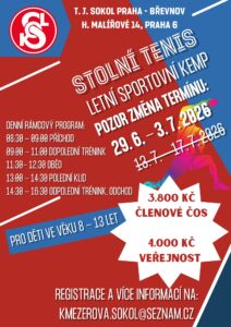 Zveme vaše děti na sportovní kemp, který pořádáme v naší sokolovně v týdnu od 13. – 17. 7. 2026. Všechny podrobnosti najdete na plakátu. Obědy i pitný režim budou zajištěny. Na odpoledním tréninku je možno vyzkoušet i jiné sporty. Ve středu je naplánovaný výlet v rámci Prahy. Přihlášky a další informace na emailu kmezerova.sokol@seznam.cz